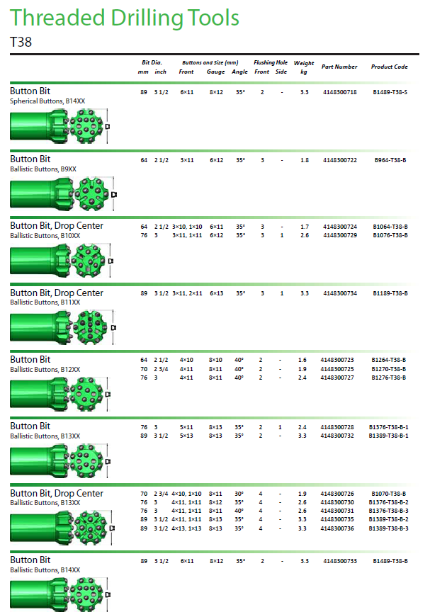 Thread Button bit is well known for its high wear resistance on medium-hard to hard abrasive rock formations (between 200 Mpa to 260 Mpa compressive strength).